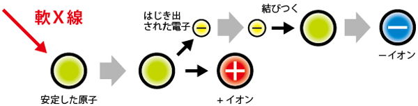 大気中にある安定した原子/分子に軟X線(微弱なX線)を当てると、電子がはじき出されます。「−」の電子がはじき出されると、元の原子、分子は「+」イオンとなります。はじき出された「−」の電子は、安定した原子/分子と結びついて、「−」のイオンとなります。